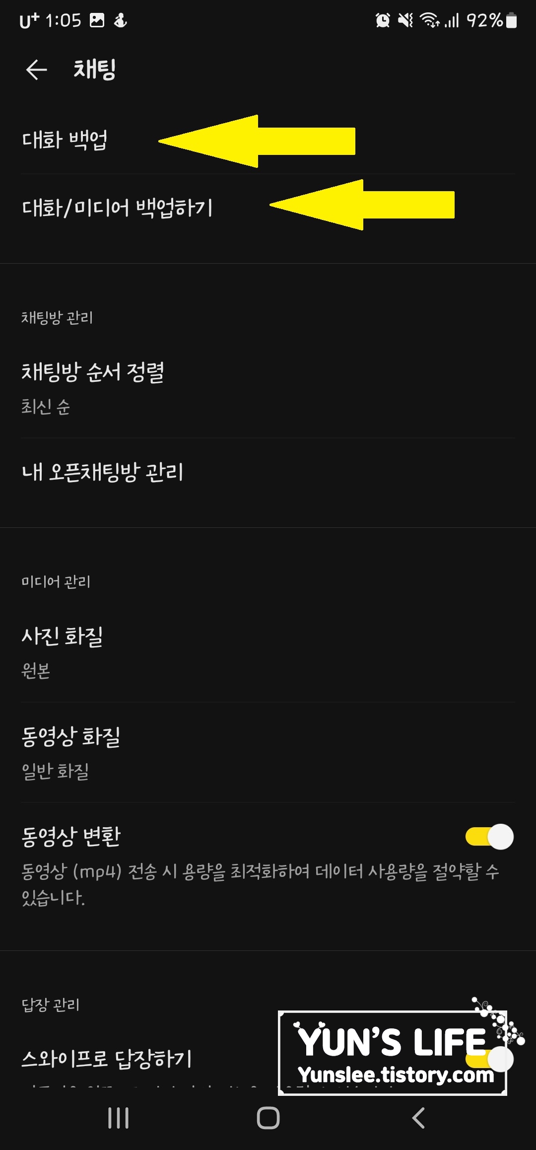 그러면 대화백업항목과 대화/미디어 백업 항목이 나옵니다.
