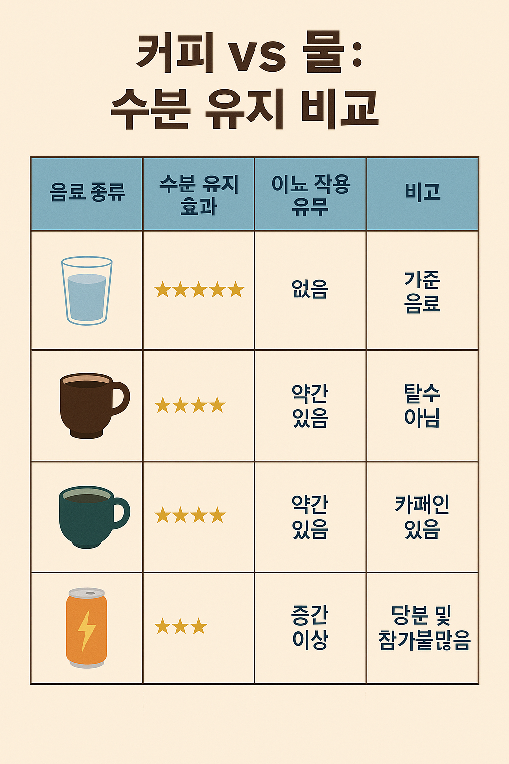 | 주의할 점 | 갈증 해소엔 물 우선, 커피는 보조 |
